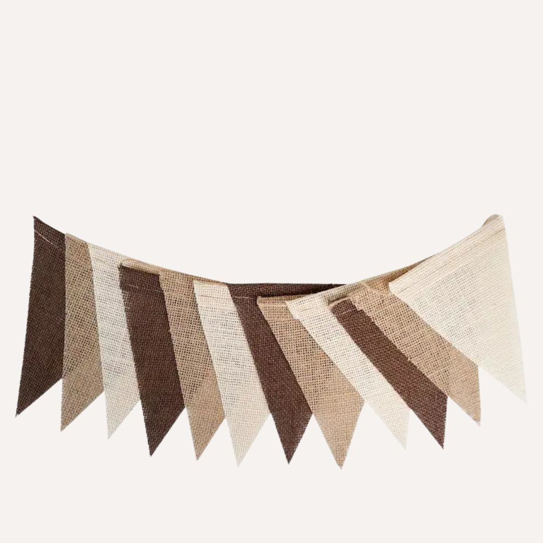 De jute vlaggenlijn met naam komt in drie verschillende opties: per 6 vlaggen, per 9 vlaggen of per 12 vlaggen. Jij kiest zelf de hoeveelheid vlaggentjes, het lettertype waar wij jouw naam op mee op de vlaggentjes mogen drukken en of je er nog een extra symbol, zoals een hartje, bij wil. We hebben de jute vlaggenlijn met naam beschikbaar in de kleuren bruin (drie kleuren), kleurrijk en naturel.
