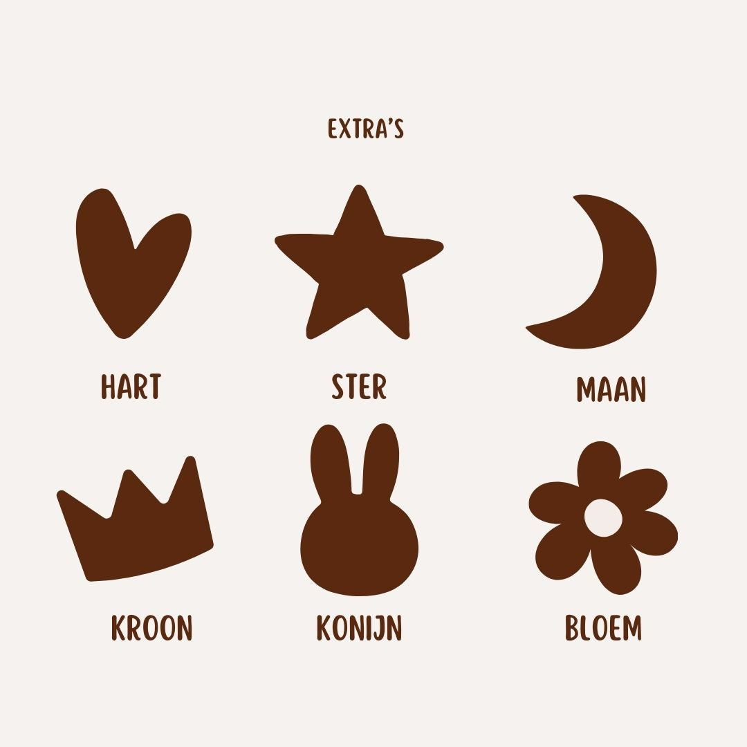 Let op: wil jij een langere vlaggenlijn, een ander lettertype, een ander soort tekst, of een ander symbool? Stuur dan een berichtje naar info@minimuisje.nl met je wensen. Er is veel mogelijk en we denken graag mee!